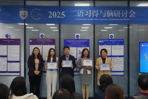 本网讯(通讯员 郑文浩)2025年10月17日至18日,西安外国语大学人工智能与语言认知神经科学重点实验室(智语实验室)在长安校区主办“二语习得与脑”学术研讨会。我校外国语学院郑文浩老师的论文《基于能力模型视角下大学生翻译能力发展实验研究》获“优秀论文奖”;刘凯文老师的论文《重铸反馈对中国英语学习者效果研究:外显度、聚焦度与二语水平的交互作用》获“优秀壁报奖”。